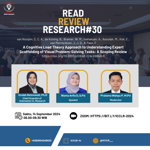 Topik expert scaffolding dalam pemecahan masalah visual dibahas pada 3R ke-30 ICCLR. Artikel dipresentasikan oleh Risma Arifa, S.Pd., dengan moderator Pratama Wahyu Purnama, M.Pd.. Diskusi menyoroti bagaimana dukungan pakar dapat dioptimalkan tanpa meningkatkan beban kognitif berlebih.